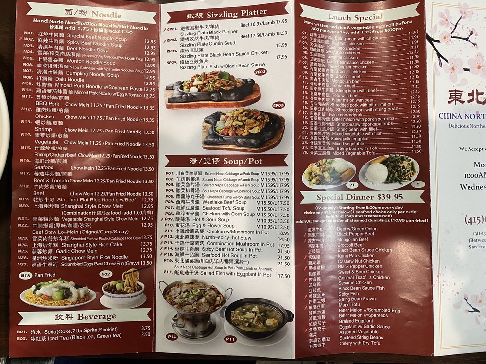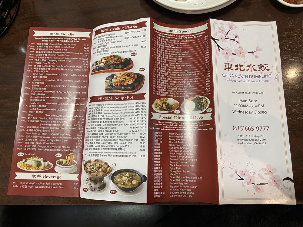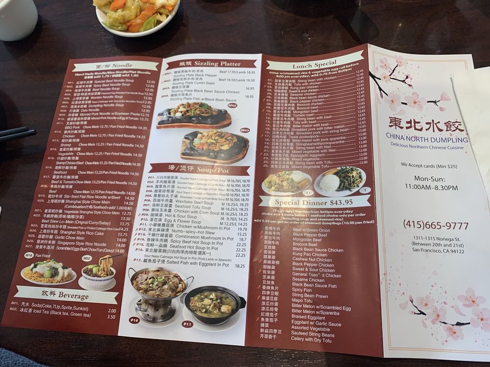 Introducing China North Dumpling, a casual restaurant in San Francisco offering a range of Northern Chinese dishes with vegan and vegetarian options. The menu features specialties like Special Beef Noodle Soup, Sizzling Plate Black Pepper Beef, and Dumpling Noodle Soup. Customers praise the authentic flavors, generous portions, and handmade noodles. The friendly service and cozy ambiance make it a great spot for lunch or dinner. Don't miss the must-try dishes like Xiao Long Bao, Chive Boxes, and Potstickers. With convenient amenities like delivery, takeout, and reservations, China North Dumpling is a top choice for authentic Northern Chinese cuisine in San Francisco.